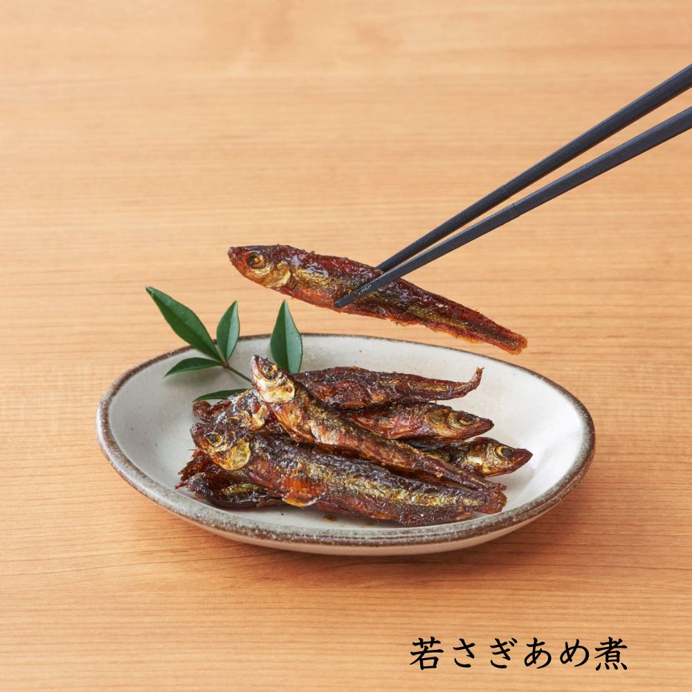 | 原材料名 | 【若さぎあめ煮】 | 若さぎ(中国産)、砂糖、醤油(小麦・大豆を含む)、還元水飴、水飴、発酵調味料、寒天 |