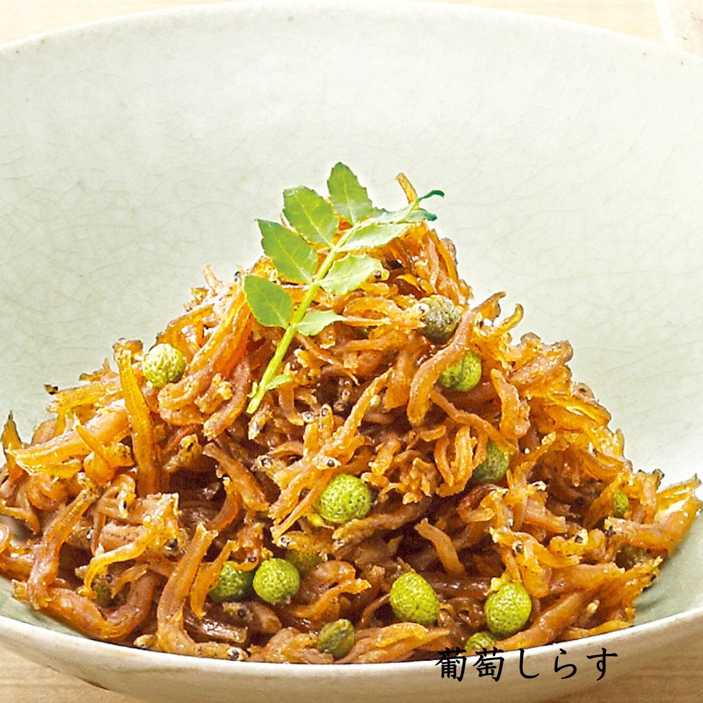 | 【葡萄しらす】 | しらす(国産)、醤油(小麦・大豆を含む)、砂糖、還元水飴、山椒の実、でん粉分解物、清酒、本みりん、発酵調味料、食塩 | |