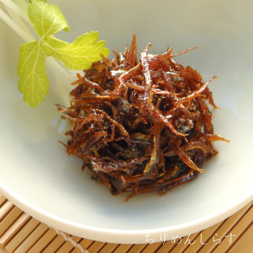 | 【ちりめんしらす】 | ギンポ(中国産)、砂糖、醤油(小麦・大豆を含む)、還元水飴、発酵調味料、唐辛子、寒天 | ||