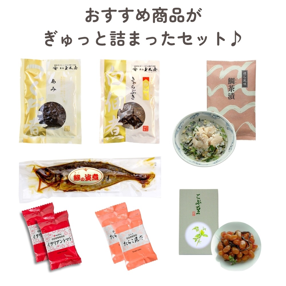 | 商品内容 | 佃煮:あみ70g、白佃煮:きゃらぶき70g、懐石茶漬:鯛(1袋)、姿煮:鯵の姿煮、ふりかけ:たらこ昆布7g、イタリアントマト(各2パック)、花珠:こぶ豆ミニ55g(全7種類入) |