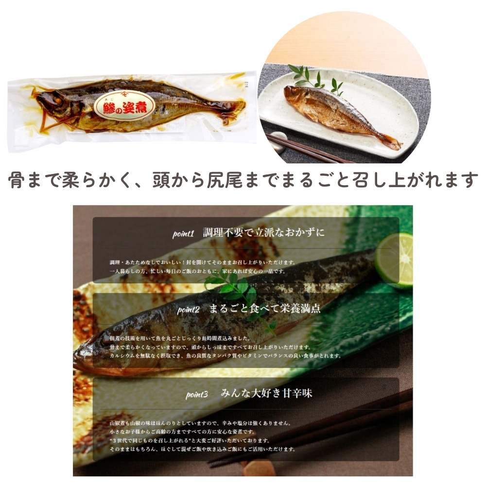 | 【鯵の姿煮】 | 真鯵(国産)、砂糖、醤油(小麦・大豆を含む)、還元水飴、本みりん、発酵調味料、醸造酢 | |