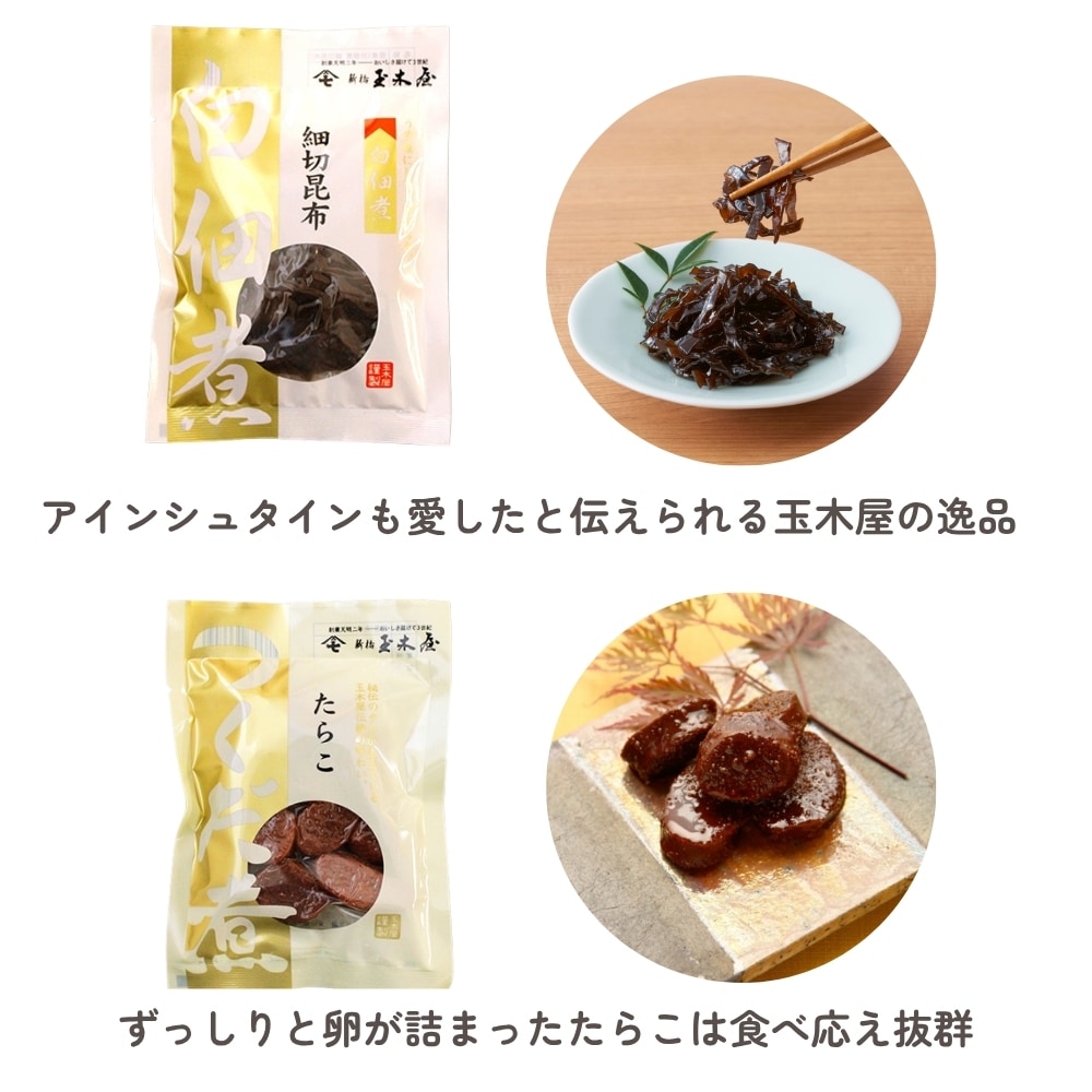 佃煮、白佃煮、お茶漬、姿煮、煮豆と新橋玉木屋の人気商品を1つにまとめました。
