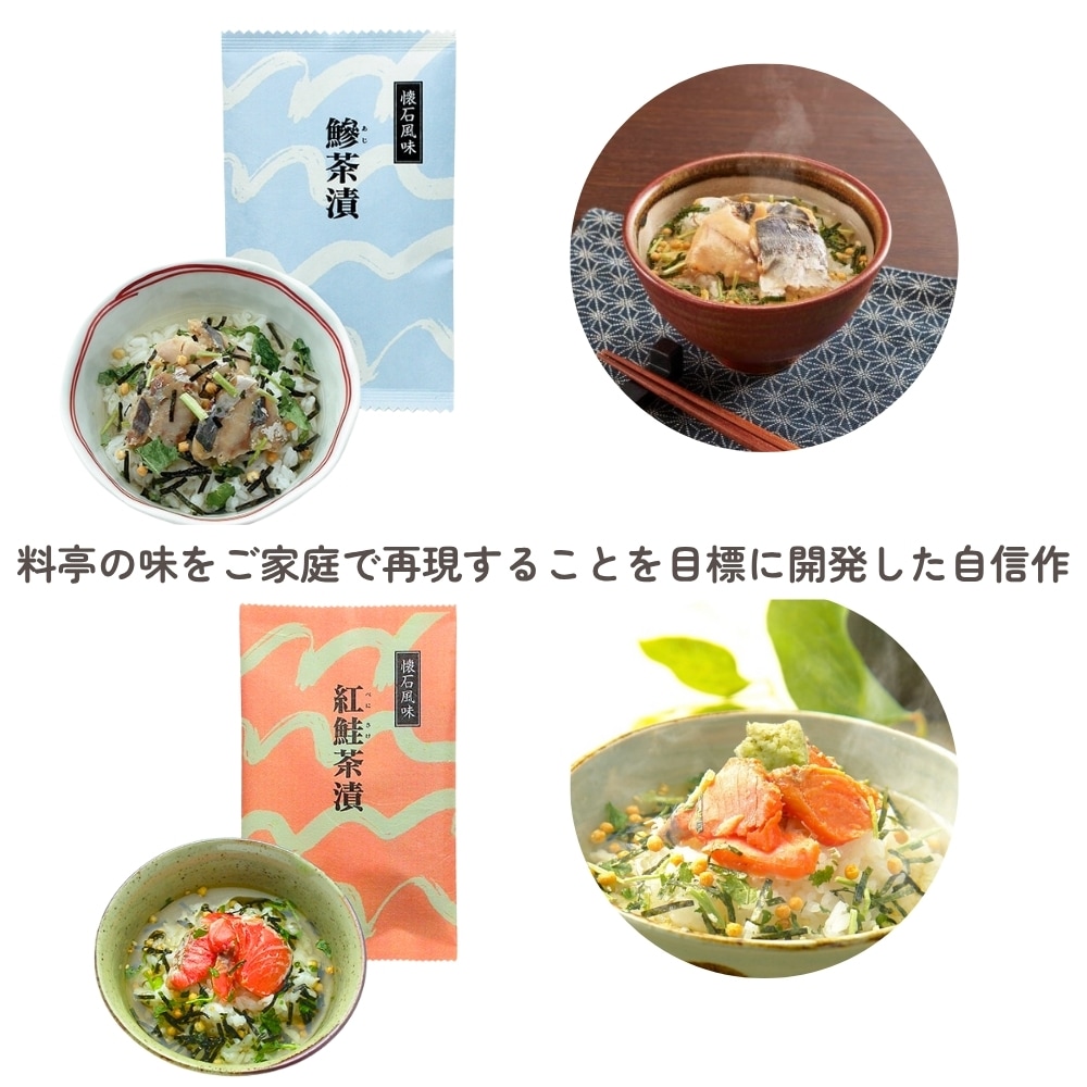 | 【懐石茶漬 鯵】 | 真鯵(国産)、醤油(小麦・大豆を含む)、清酒、生姜、かつおエキス、砂糖、米酢、水飴、本みりん、発酵調味料 かやく:あられ(国内製造)、ごま、刻みのり、ゆず、わさび、三つ葉 だし:かつお節粉末(国内製造)、食塩、醤油(小麦・大豆を含む)、昆布エキス、砂糖、本みりん、発酵調味料 | |