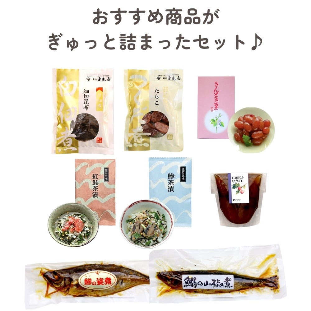 | 商品内容 | 佃煮:たらこ70g、 白佃煮:細切昆布70g 姿煮:鰯の山椒煮(1尾)、鯵の姿煮(1尾) 懐石茶漬:紅鮭、鯵(各1袋) 花珠:きんとき豆ミニ55g いちじくグラッセ (全8種類入) |