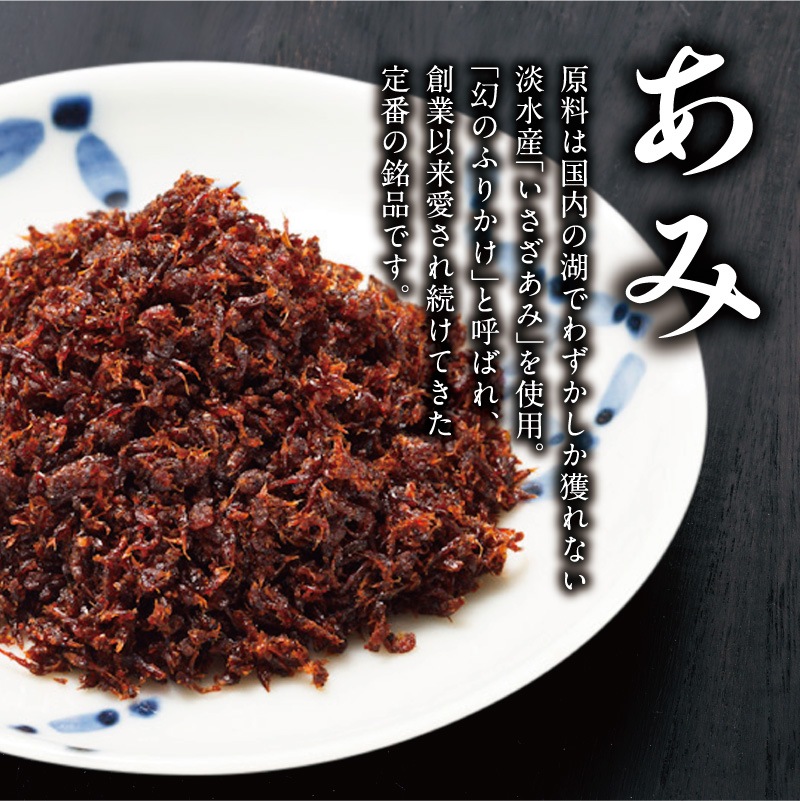 定番の「あみ」は、幅広い年齢層に人気の佃煮。お醤油の代わりに卵かけご飯にふりかけても美味しく召し上がれます。