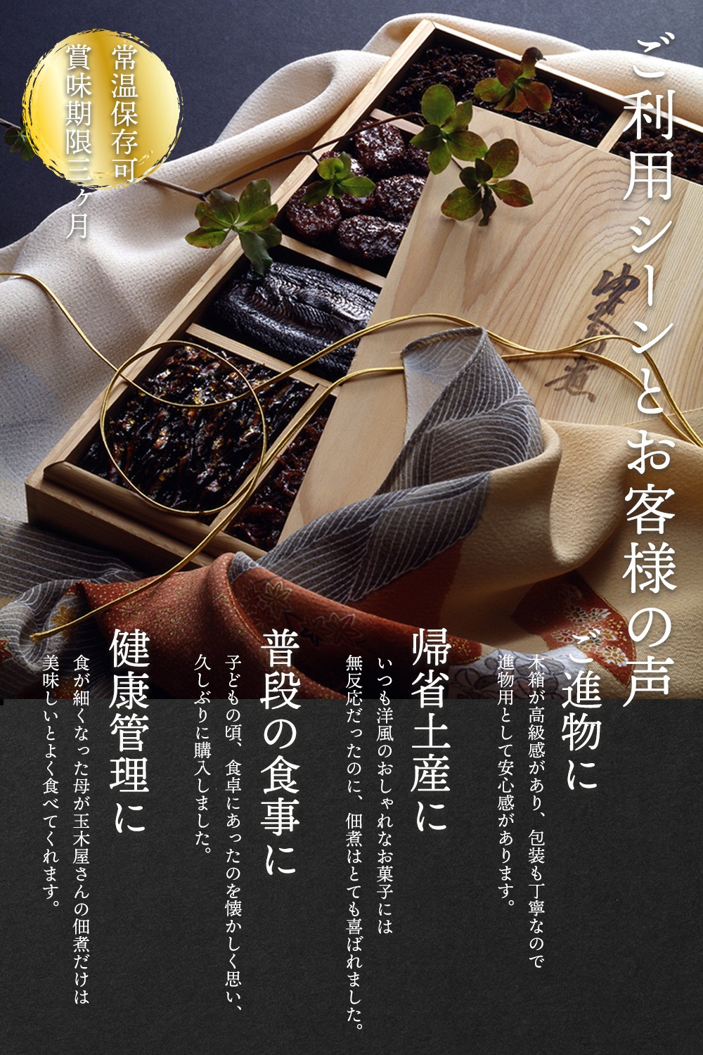 玉木屋秘伝のタレを使用し、昔ながらのきりっとした濃口の佃煮に煮上げました。