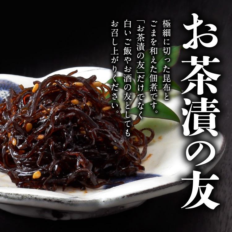 | 【お茶漬の友】 | 昆布(国産)、醤油(小麦・大豆を含む)、砂糖、ごま、還元水飴 | |