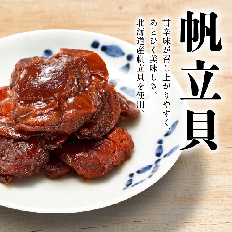 | 【帆立貝】 | 帆立貝(国産)、砂糖、醤油(小麦・大豆を含む)、還元水飴、生姜、本みりん、発酵調味料 | |