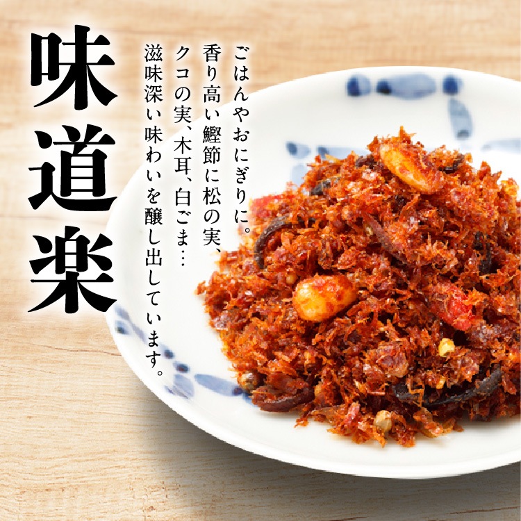 | 【味道楽】 | かつお削り節(国内製造)、醤油(小麦・大豆を含む)、砂糖、清酒、本みりん、発酵調味料、ごま、松の実、木耳、クコの実 | |